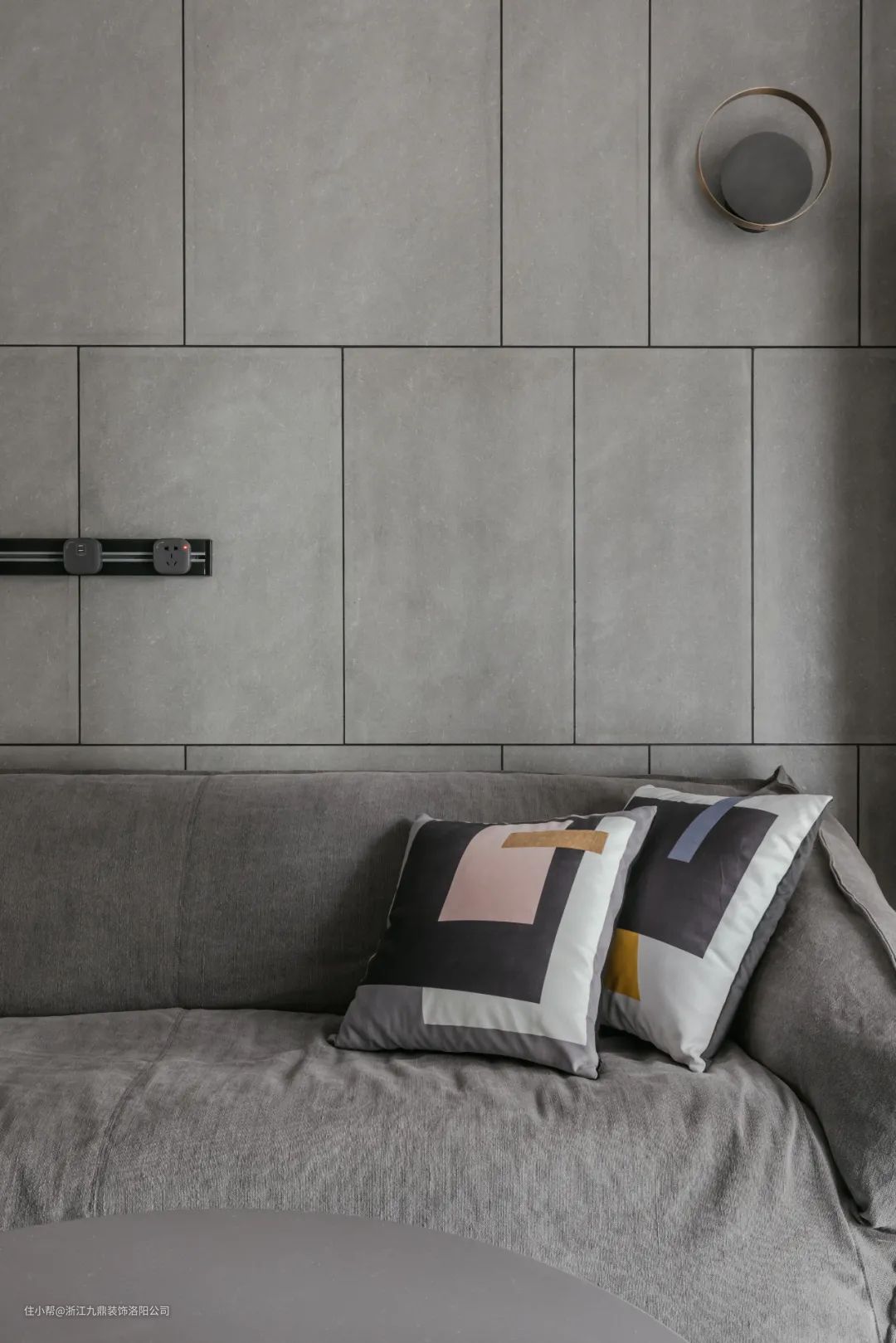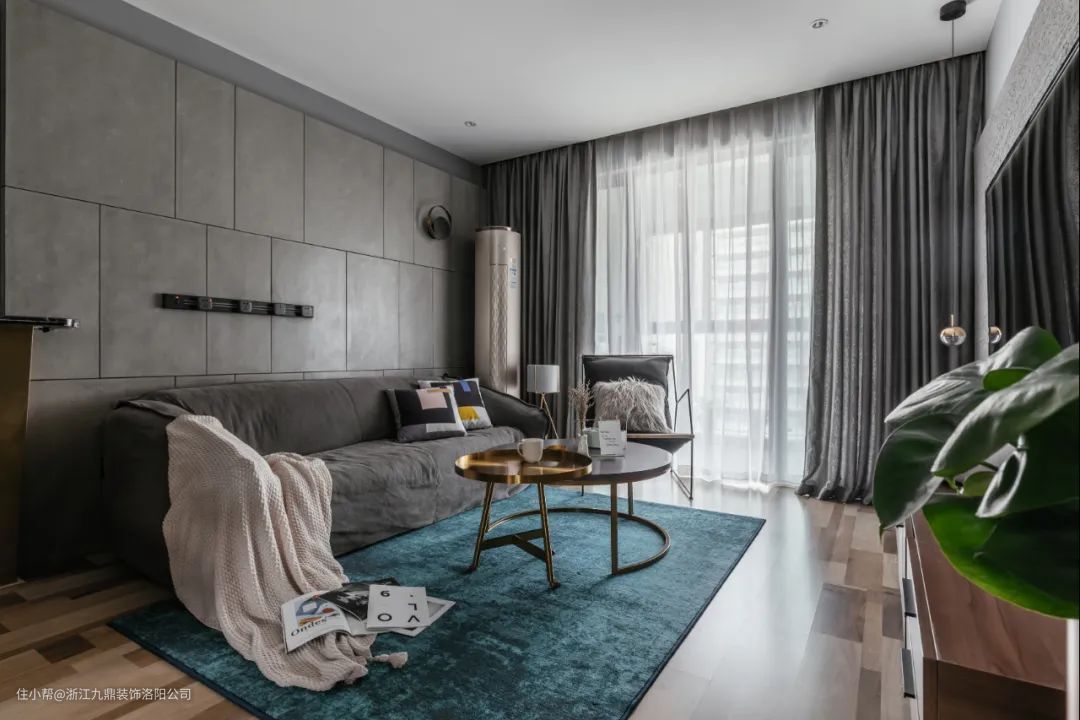 沙发背景墙是灰色的岩板背景材质,与沙发的灰色形成对比,色彩层次更丰富。蓝色的绒地毯充满惬意温馨的感觉。