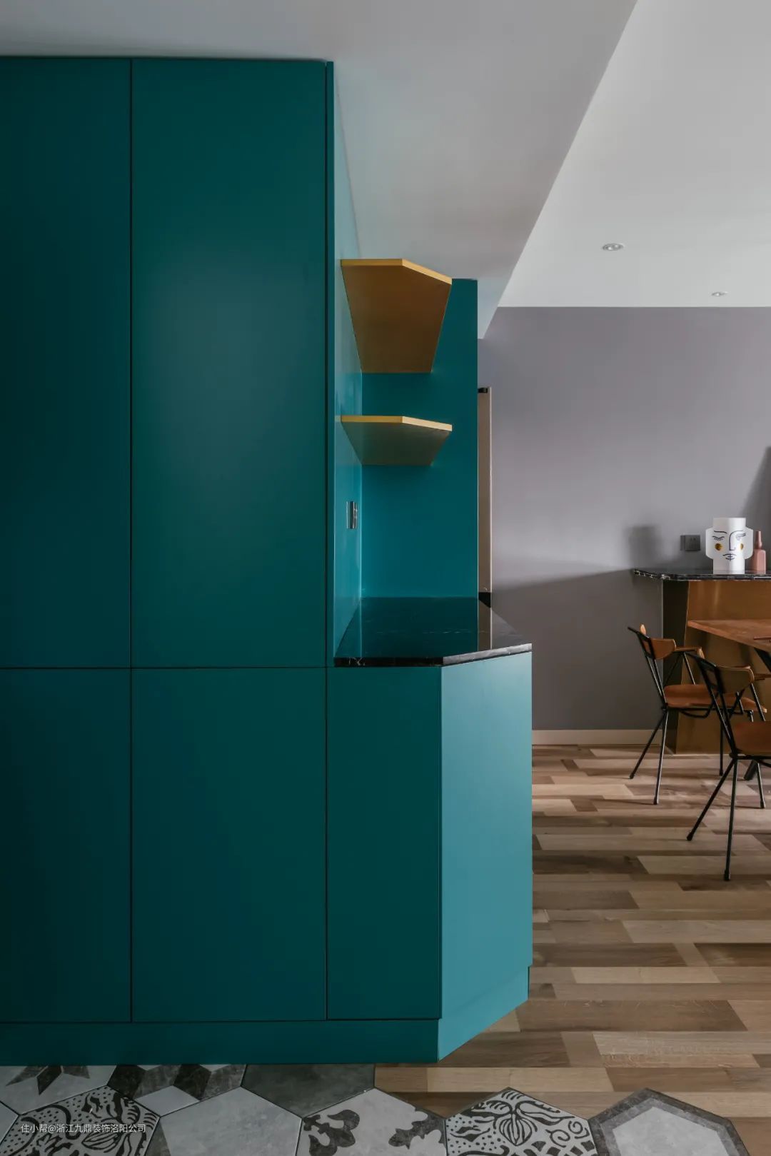 玄关瓷砖用了六边花砖,和客餐厅区域有一个自然分区,加上蓝色的通顶玄关柜,自然舒适又充满文艺气息。