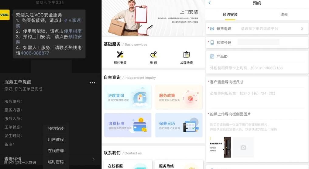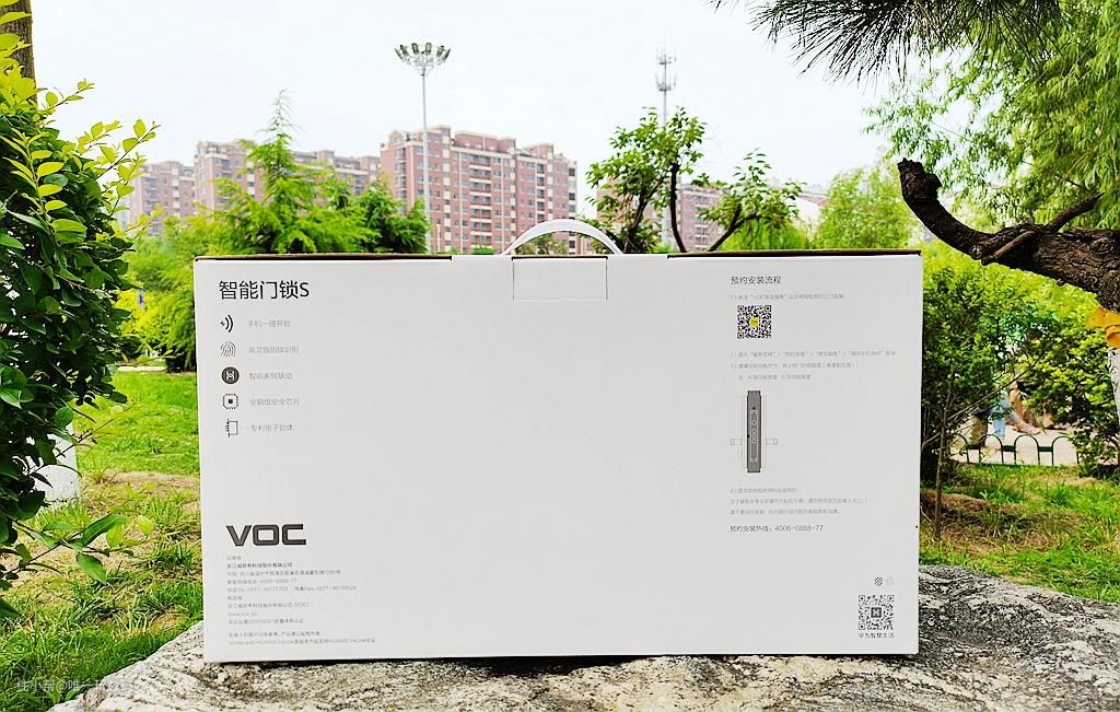 华为智选VOC智能门锁S,包装背面诸多卖点:手机一碰开锁、高灵敏指纹识别、智能家居联动、金融级安全芯片以及专利电子锁体等亮点。此外还有预约安装的流程,拿到快递后第一时间记得按照相应的流程,关注服务号(VOC安全服务)预约安装。当然如果你是一个DIY能手,也可以自行安装,但是对于普通用户来说,建议联系公众号,VOC会免费派安全专业人员安装。