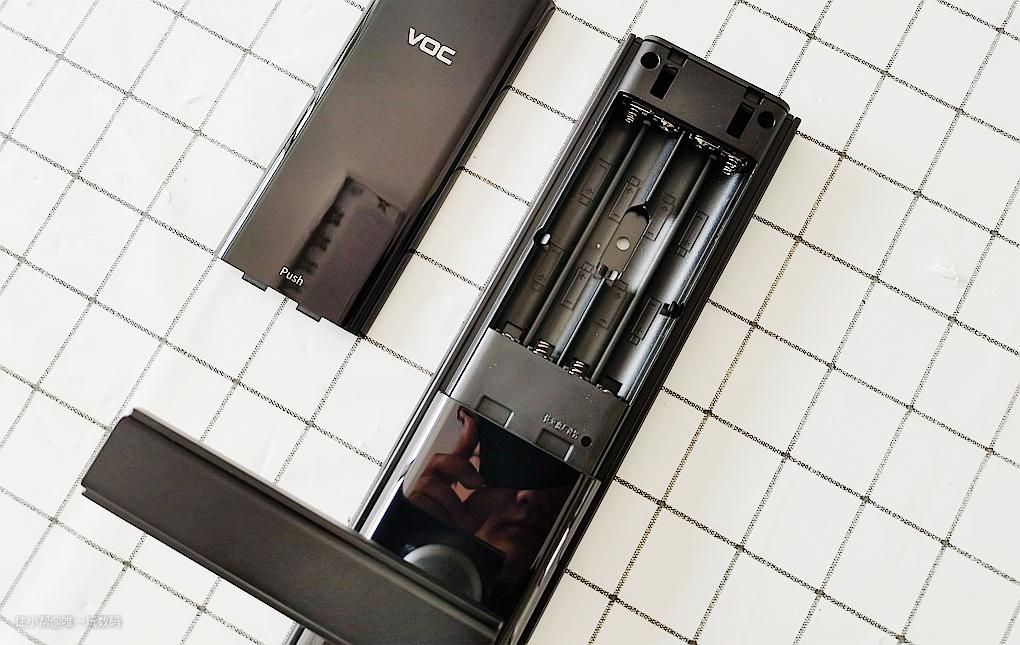 华为智选VOC智能门锁S内侧面板把手上方是电池仓,需要8节5号电池,待机时长12个月。而且厂家特别赠送了8节南孚电池,可以最大程度的支撑智能锁的长时间使用,不用经常担心电池耗完电的问题。