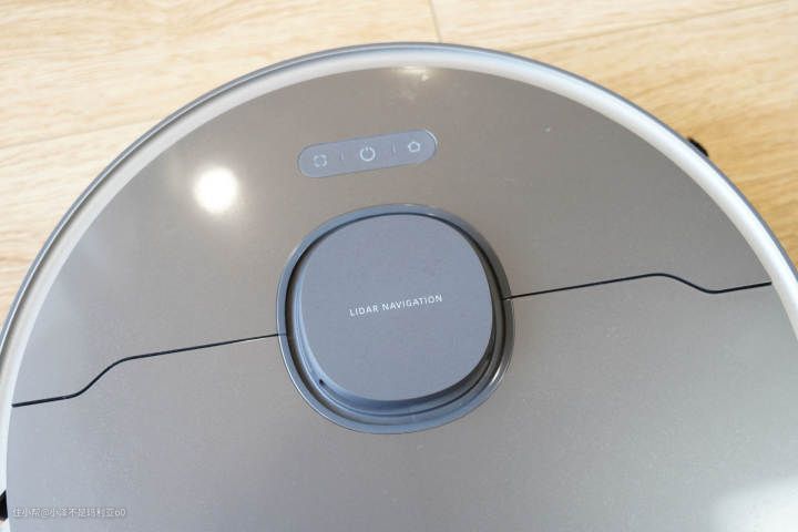 ▼顶部依然搭载了追觅最新一代的LDS激光导航雷达,前方的三个按键分别为回充键,电源键以及划区清扫按键。