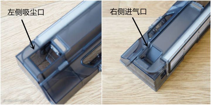 ▼观察尘盒左右两侧的集尘孔也不难发现,两个孔洞不仅形状大小不同,而且开合方式也有所不同。尘盒左右两侧集尘孔的档板一个向内侧打开,一个向外侧打开,再一次印证了两侧集尘孔完全不同的功能。