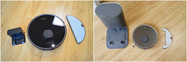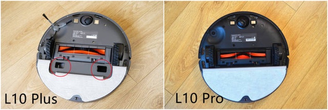▼尽管L10 Plus只是上一代的自动集尘版本,但依然让人忍不住将两者拿出来比较一番。两台扫地机的基础'组件都为主机、二合一拖地水箱,以及充电基站。
