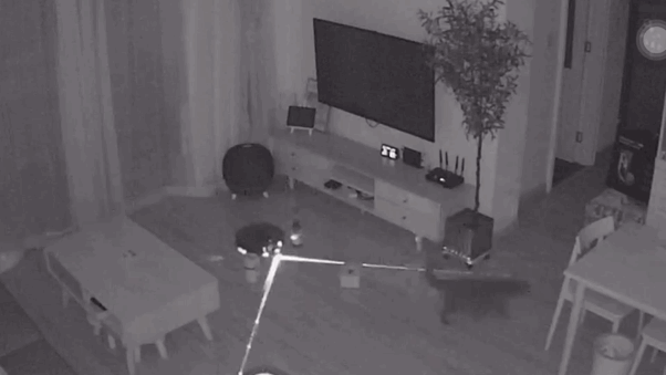 在红外夜视仪下,可以看到L10 Plus不断的向四周发射两条交叉的激光,然后再根据激光的反射时间准确计算出障碍物的距离。相对于视觉避障技术,双线激光避障技术对于物体距离的把控要更为精确。