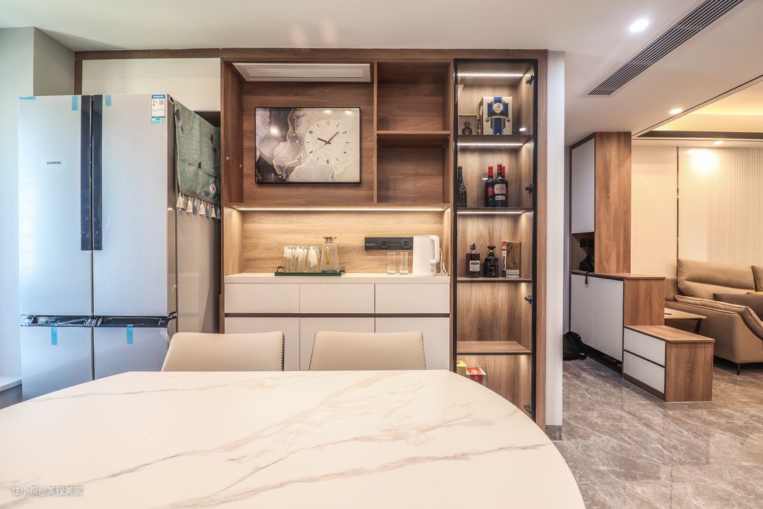 靠墙的位置做了整面的餐边柜酒柜和冰箱结合,这里是主要的收纳位置,柜体设计十分的开放时尚,酒柜部分采用了透明柜门和内嵌暖光灯带。因为餐厅也是无主灯设计,灯带烘托了整体的采光氛围,方便又实用。