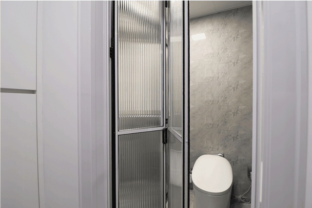 衣帽间和主卫之间做了可以折叠的隐形玻璃门设计,坚固耐用四周加了密封条可以有效的防潮防湿,阻隔尬尴的异味,与衣帽间巧妙的融合在了一起,简约美观。