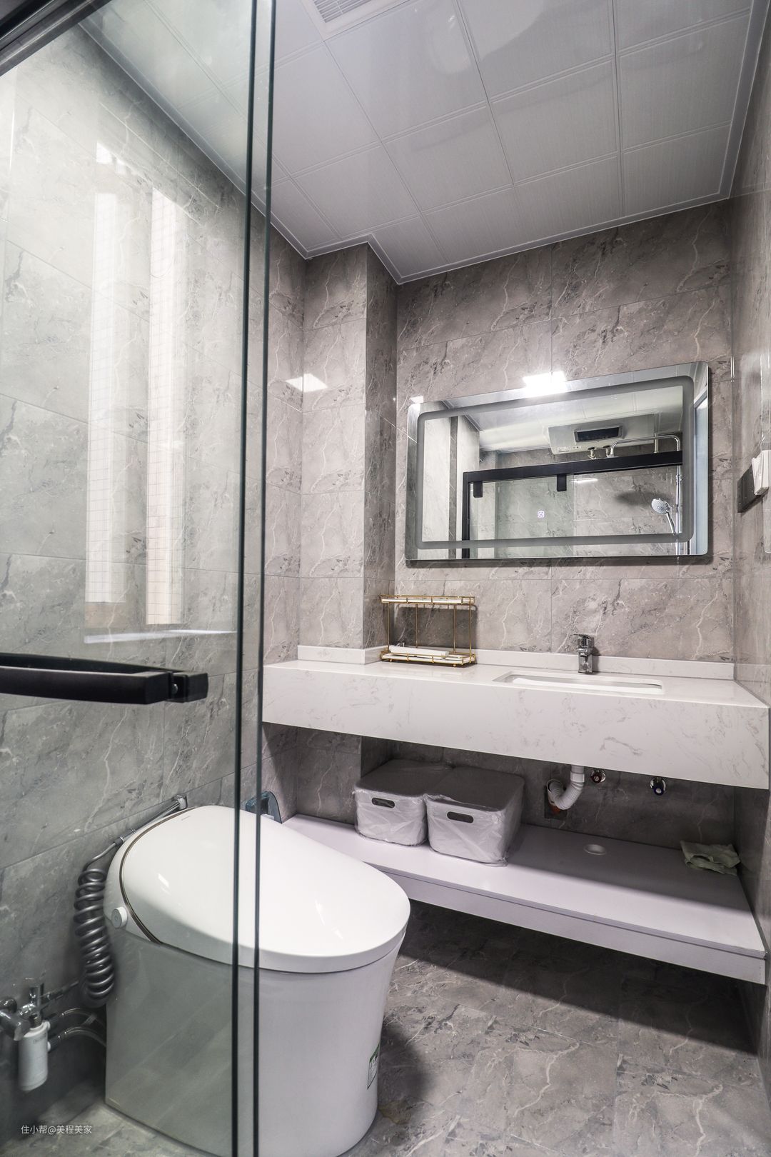 主卫是标准的三分离,浴室柜是特别定制的造型,这样的双层开放结构非常方便清洁和打扫收纳。要么全落地,要么开放式方便打扫,不留任何的卫生死角。