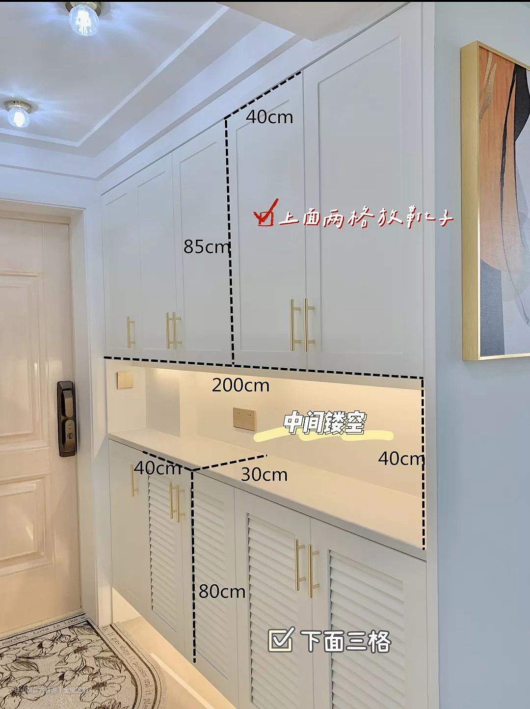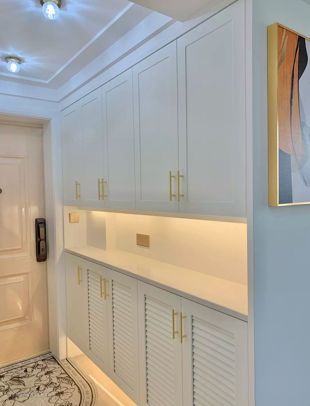 玄关柜已经是任命生活中不可缺少的储物柜了,不仅能够第一眼提升家庭颜值而且还特别实用,一个 好的玄关柜决定着业主家的颜值.附上尺寸图 入户玄关柜板材用的是多层实木板材,搭配金色拉手 小衣帽间收纳柜衣柜内嵌灯带设计 非常的有氛围感