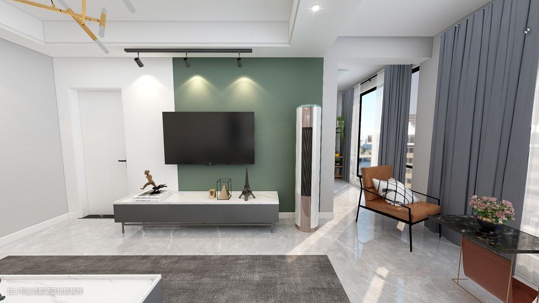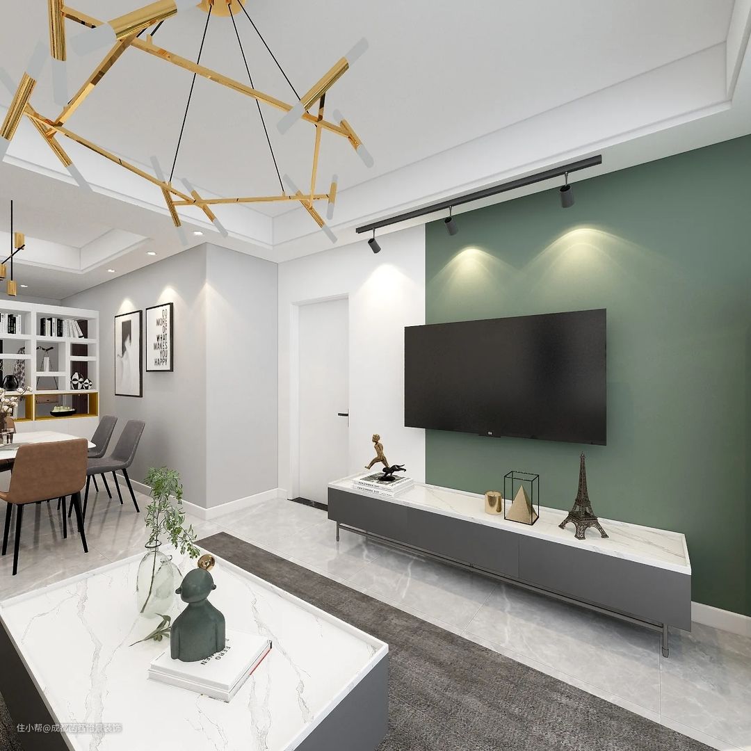 客厅整体以灰色调为主,背景墙用的草绿色与白色拼接,整体处理的比较简洁,没有过多的造型。为了保证层高,客餐厅只做了简单的边顶,局部点缀灯带,让居家的灯光更加柔和。