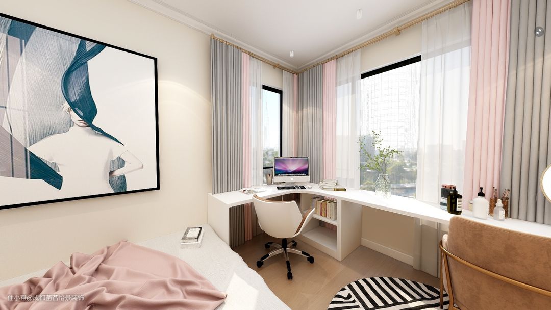 次卧床尾墙面弧形梳妆台办公桌,业主可以在这里梳妆和办公,满足业主多样化的需求。悬空式的设计,让清扫不留死角。