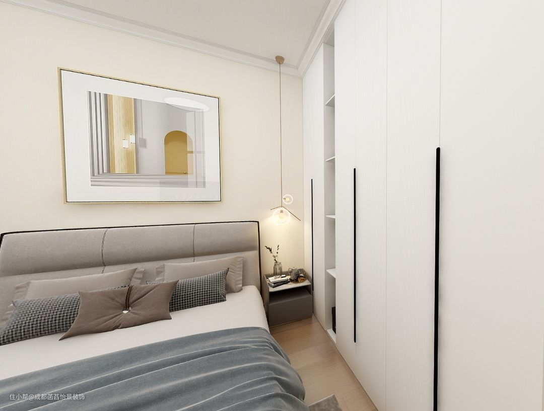 次卧的设计语言继续谱写简约温暖格调。挂画的光泽与大理石的纹理与奶白色的墙面表现出丰富的层次。