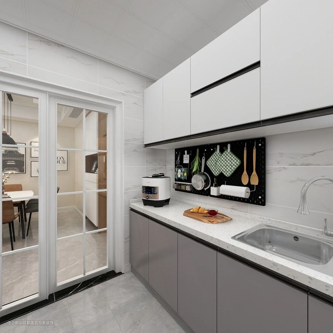 女主对厨房的面积和功能要求较高,原始厨房无法满足屋主的需求。所以设计师拆掉墙面改用玻璃推拉门,将厨房面积扩大一倍,并进行了双动线设计,食材采买后由门厅落尘区直接进入厨房再从厨房到达餐厅,空间动线更加合理和流畅。
