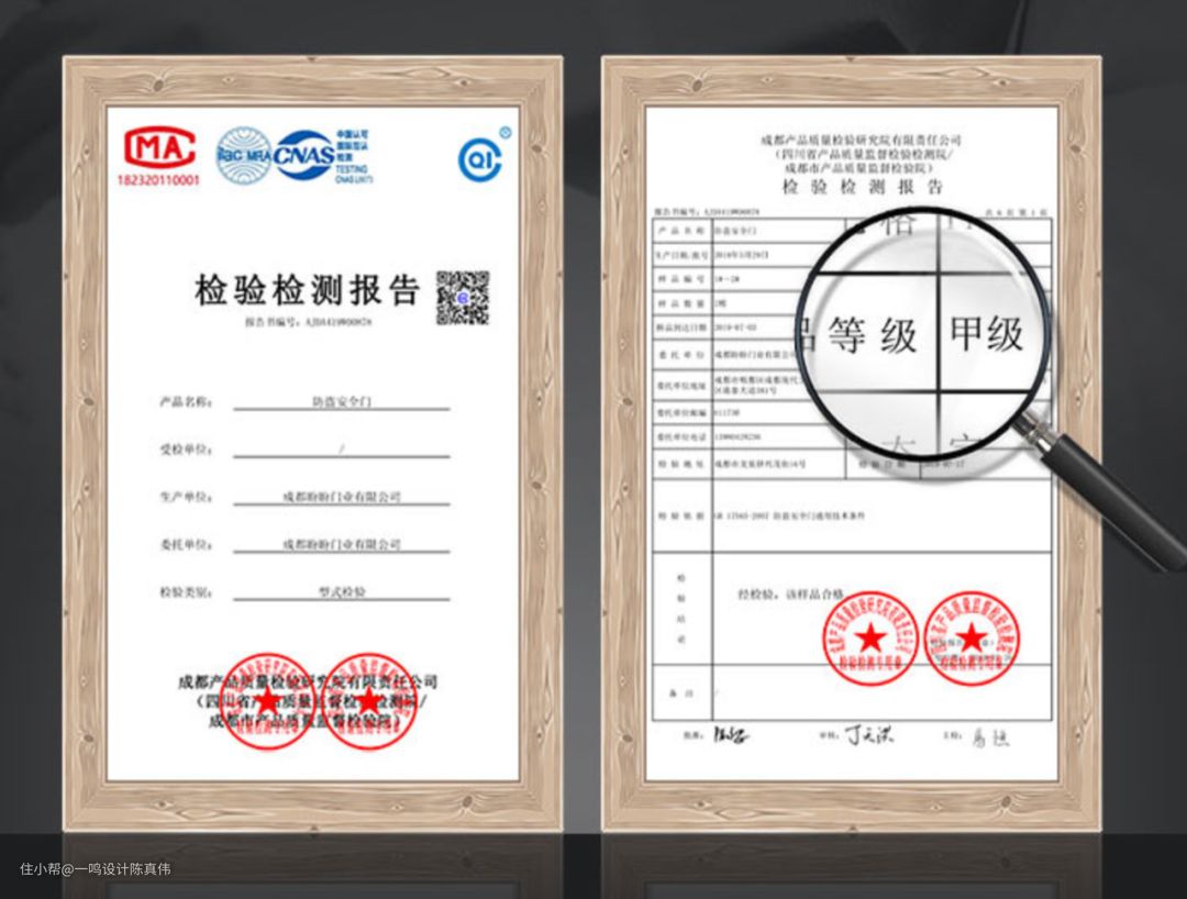 很简单,先看《检验报告》和“等级标识”。正规的防盗门都有它们的“身份证明”。