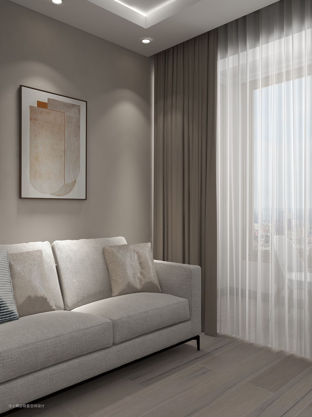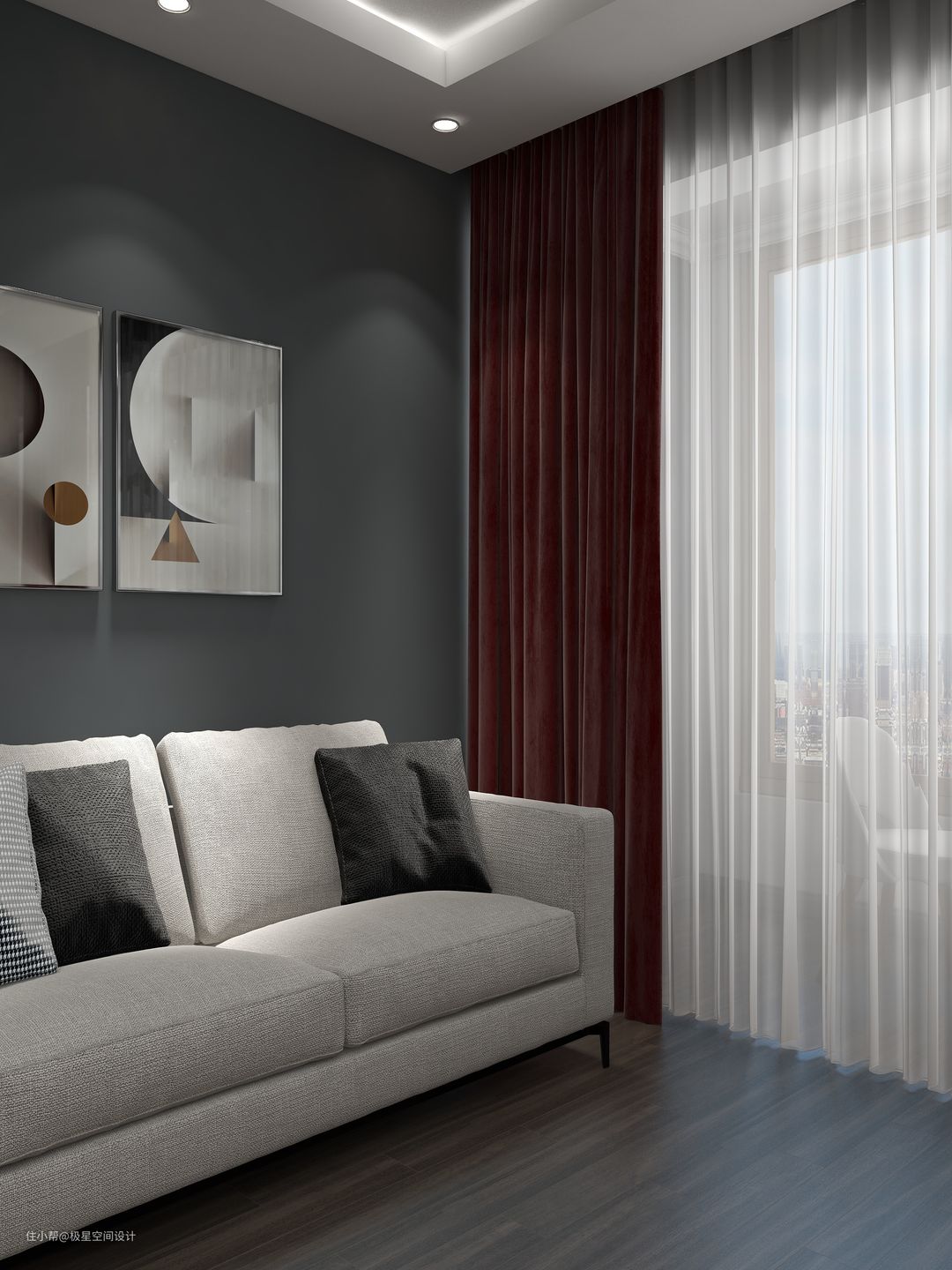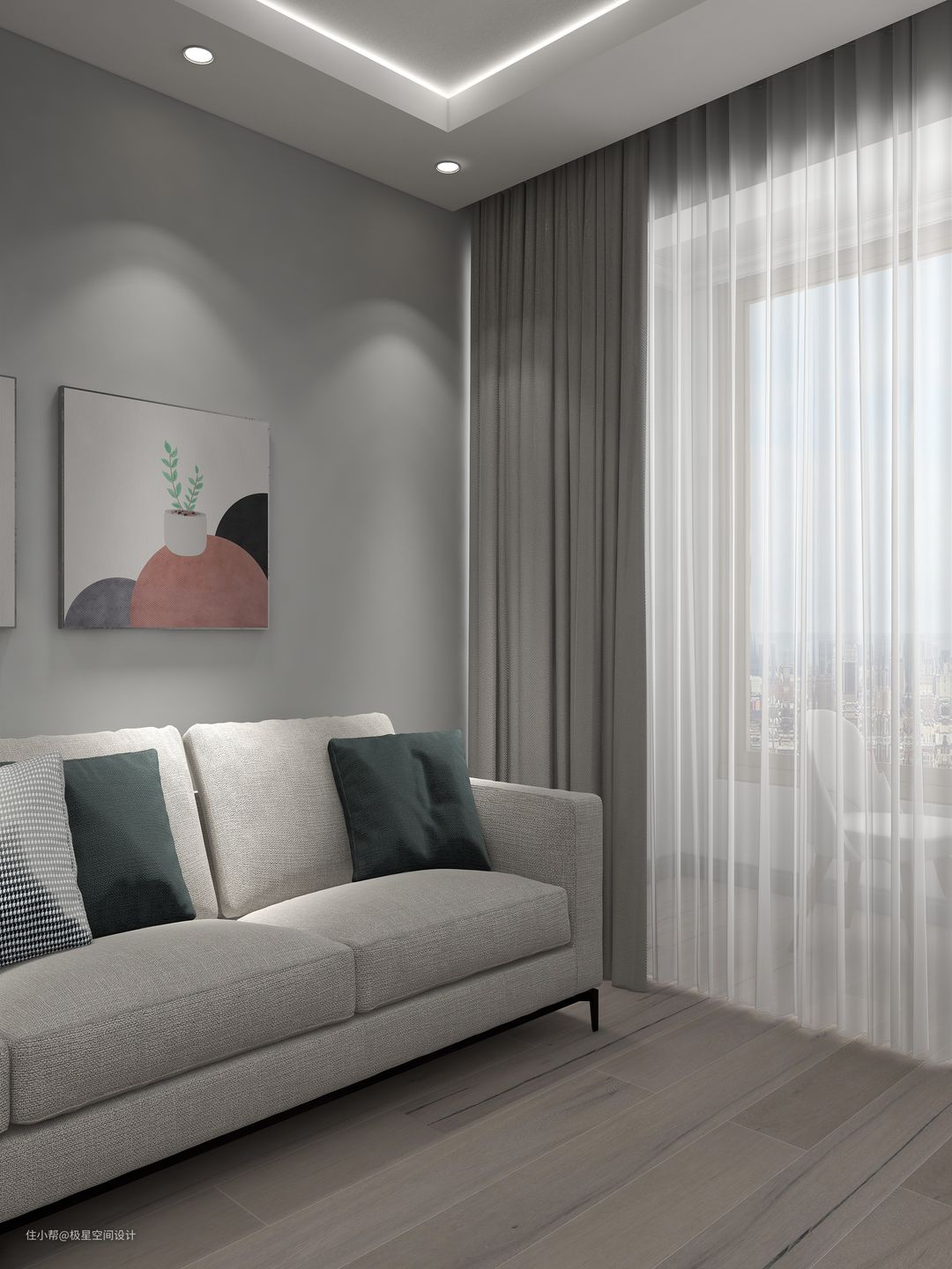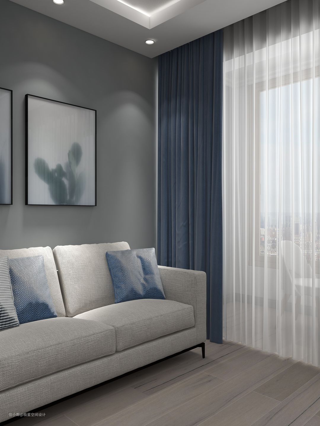 白纱雾霾蓝帘,会是整个房间清透的同时不失格调,与无论是深灰还是浅灰色的墙面搭配起来都毫无违和感。但软装挂画方面最好要局部留白,这样搭配更舒适。