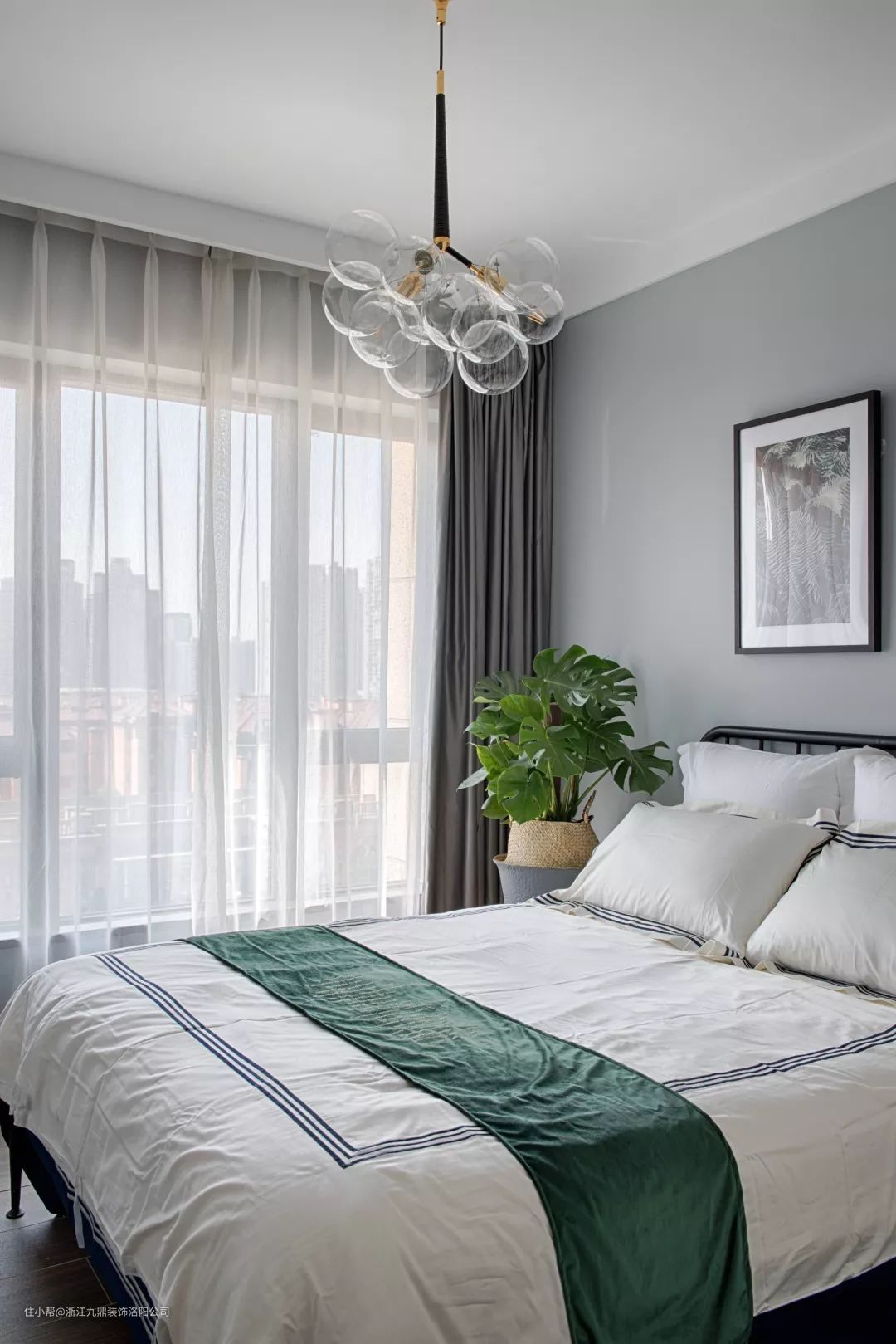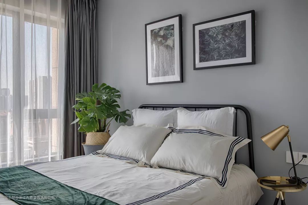 次卧墙面选择了低调的灰色,黑色的铁架床、金属的台灯让整个房间更和谐