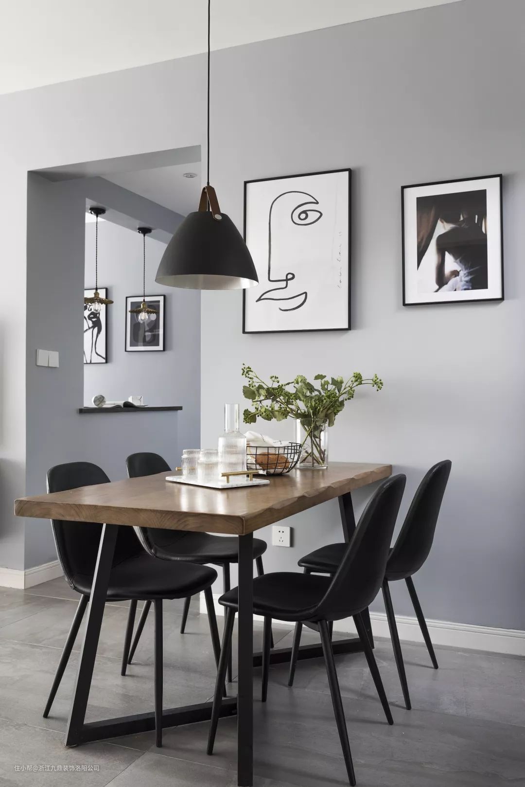 木质的餐桌搭配黑色的椅子和吊灯,简洁大方。墙上抽象的装饰画更是达到了意料之外的效果。