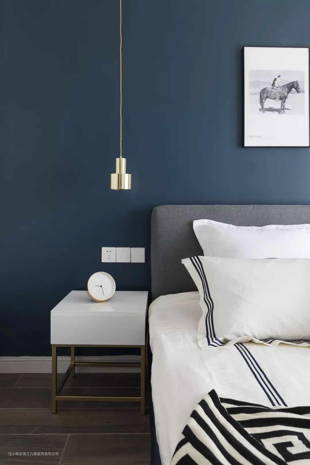 主卧墙面选择了沉静的深蓝色,搭配白色能起到舒适放松的作用,色彩搭配是一门玄学呢