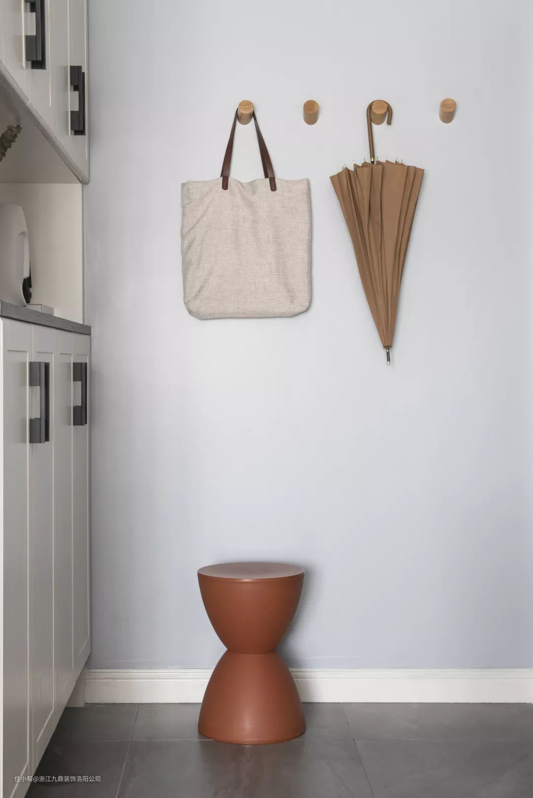 入户装了通顶的玄关柜,中部底部镂空,日常使用更加方便,墙面安装了实木挂钩下方还有换鞋凳,简约大方!