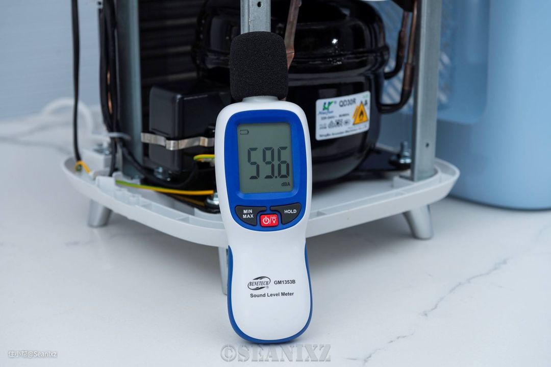 噪音方面,环境噪音37dB,拆开外壳紧贴机器测试到压缩机运行时噪音为59.6dB,噪音较大。