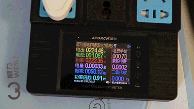功耗方面,记录了1小时左右的连续工作,启动时会有个较大的启动电流,功率峰值400W,稳定工作时功率200W左右,符合铭牌上的标称值,压缩机的工作时段也是间歇式的,不是一直都在以200W的功率工作,稳定后大部分时间是8W的风扇工作是的功率,整体来看不是非常耗电。