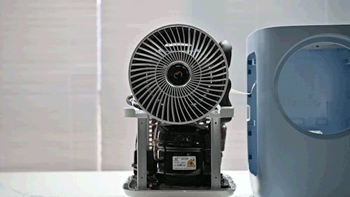 最近新的设计也出现了,它带有全套空调的压缩机、蒸发器、冷凝器毛细管等全套配置,可以持续不间断地搬运冷量,吹出冷风,是个真正意义上的空调,也是真正意义上可以制冷吹冷风的风扇了。