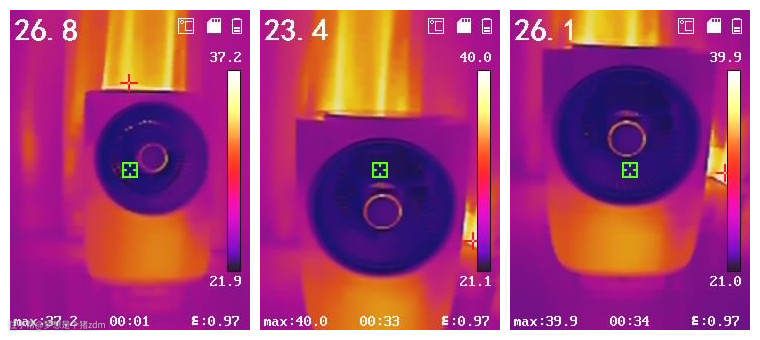 通过红外热成像仪可以看到,出风口不同位置处的温度情况,测试了几个点位,温度都低于27℃,其中最低的一个点位温度仅有23.4℃,这应该是机器内部蒸发器附近的温度,总体来说,出风口的温度确实是低于环境温度,吹出来的风确实的有明显的凉意。