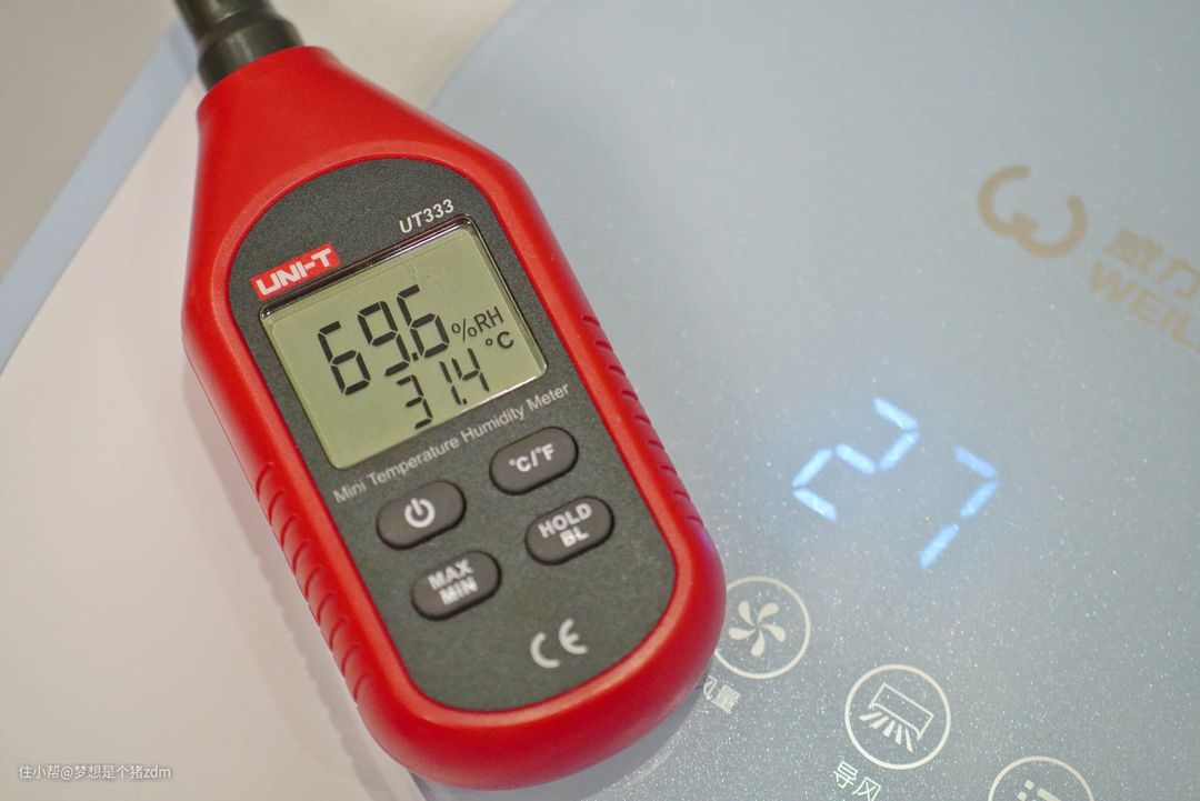 用温湿度计测试目前室内的环境温度,温湿度计显示当前环境温度为31.4℃,确实是非常的闷热,而这台移动空调显示的出风温度为27℃,也就是说比环境温度要低4.4℃。