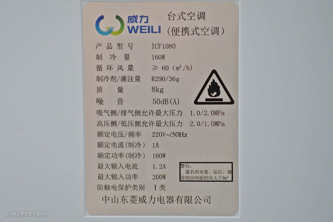 通过机身背面的产品铭牌可以详细了解到这款机器的所有参数,从铭牌上可以看到,这款移动空调的制冷量为160W,制冷量指的是空调在规定制冷工况下,单位时间内可以从室内转移到室外的热量,我们可以对照一下1P空调的制冷量,我国的标准是2500W,从这个对比看,这款移动空调大约相当于0.064P,是不是有点小?