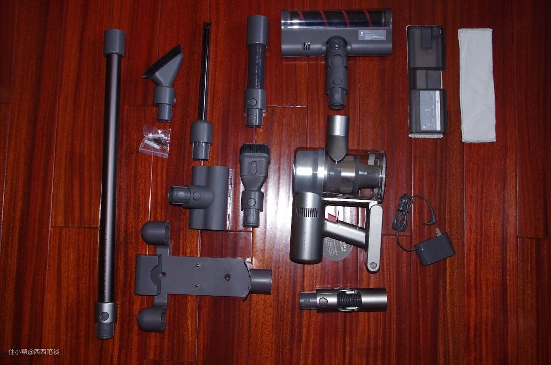所有的物件整理一下,配件确实很丰富,基本上可以覆盖我们日常所有的使用场景。长的、短的、吸地板的、洗床上的、吸地毯的,甚至连你用来吸角角落落的吸头还给你带个灯,这你受得了吗?!