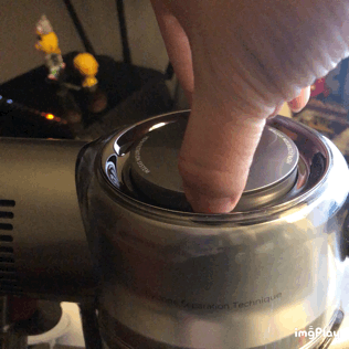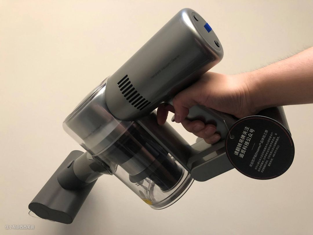 机器的主体是这样的,中间上面的是一个 HEPA 的空滤,下面是集尘盒。主体与现在流行的一般小家电略有不同,有点金属质感的镜面,略带点小高级。然后整体把持感也非常的不错,不是那种轻飘飘的不踏实感,也不是那种重地拿着会手累的感觉,整体重量控制得非常好。