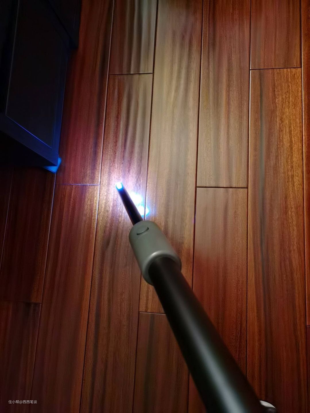 这个细细长长的窄缝吸头装上去之后,竟然在尖尖头上还装有灯光。这个设计非常人性化,方便你对细缝、或者较暗的角落进行清洁的时候给予足够的灯光,否则看也看不清,谁知道角落里的灰有没有被清扫干净。