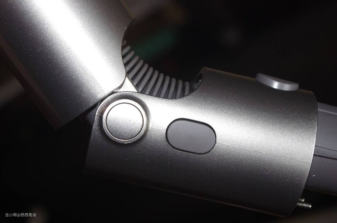 上下各有一个按键,上面一个是在连续模式和非连续模式之间切换,下面的按键是用来切换吸力的。吸力共有三档:持久、强劲、超强,显示屏相比 LED 闪烁灯,更直接的提醒我剩余电量、吸力大小以及工作状态,并且当吸尘器出现故障时,也能实时显示故障原因,非常的方便。