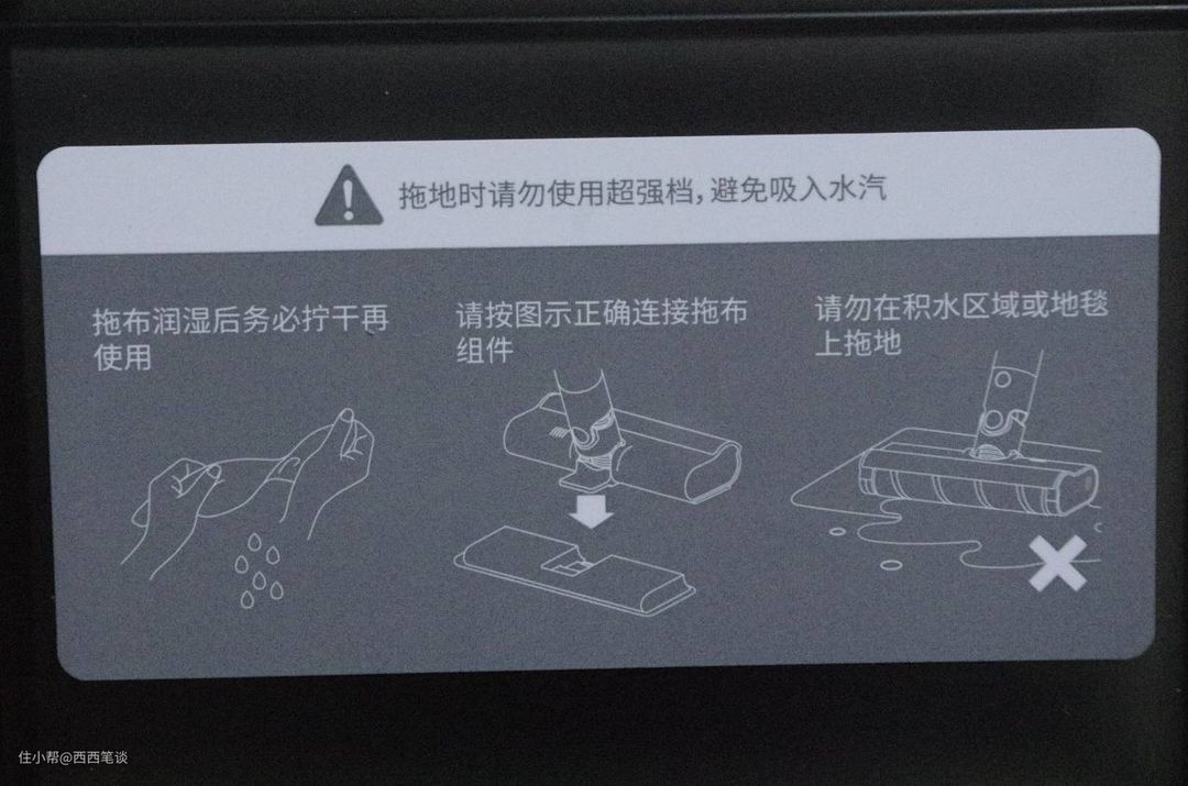在渗水水箱上贴了一个很清晰的标签,其实就是说不要在水过多的情况下使用追觅 V12,毕竟水直接吸进去肯定会有不好的地方,我知道其一就是有水的话,吸进去的灰尘会结块。