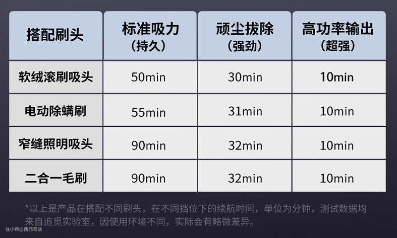 官方也给出来了在使用不同刷头的情况下,在持久、强劲、超强三个档位上,分别可以使用的时间。其实正常使用的情况下,充电一次把整个家清扫一下还是绰绰有余的,毕竟家没有这么大 T T。