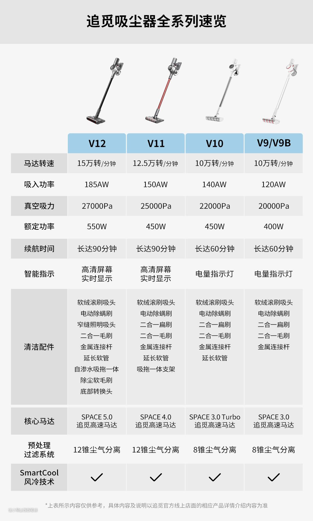 通过这张表格的对比,就能知道追觅 V12 这货在功率、马达转速和吸力方面确实是有过人之处的。