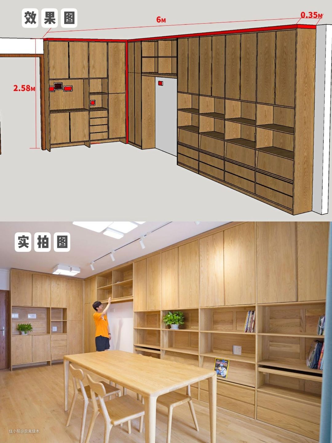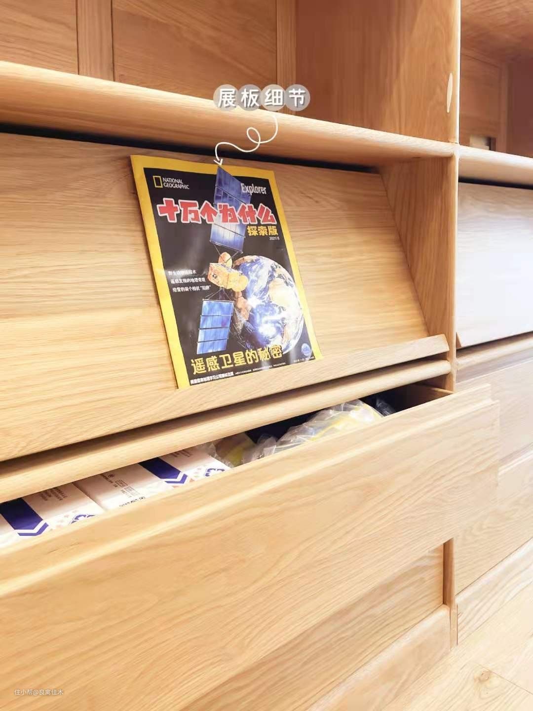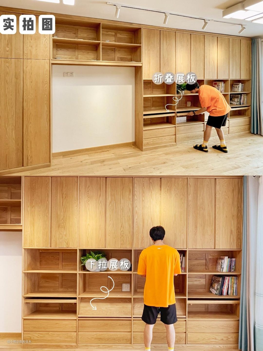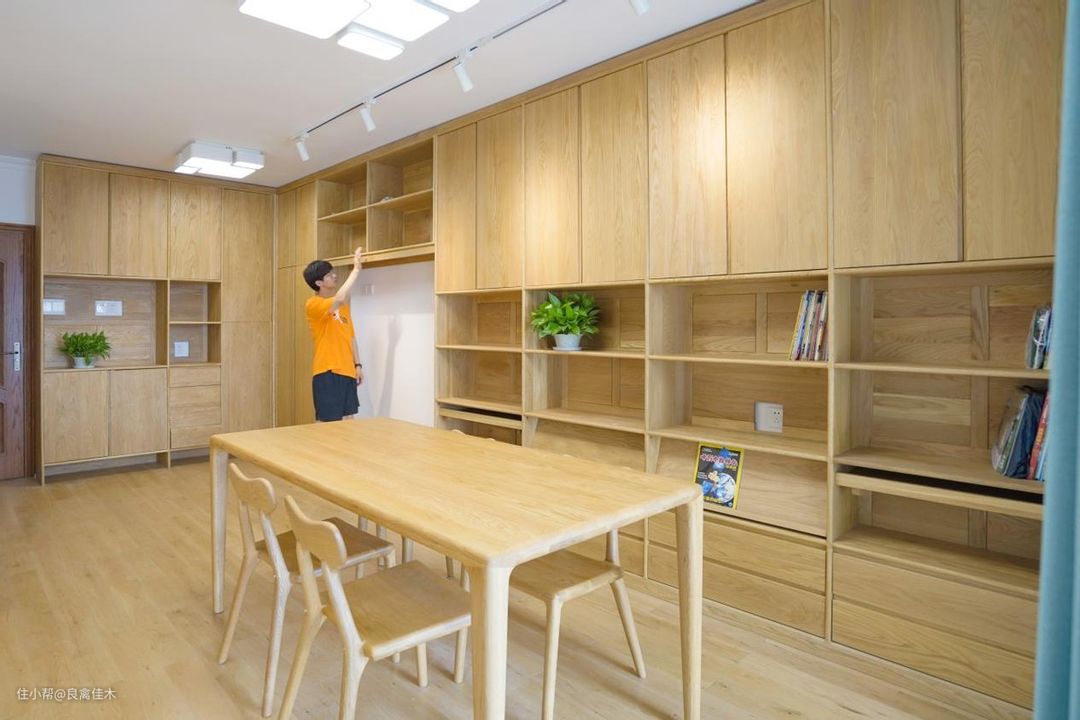 ③书房:中间区域是开放格放书,下方还带展板下拉放孩子常翻阅的书,隐藏储物,还方便取阅,上方和下方都是封闭储物,有藏有露视觉上也清清爽爽,减少了积灰打扫的频次。