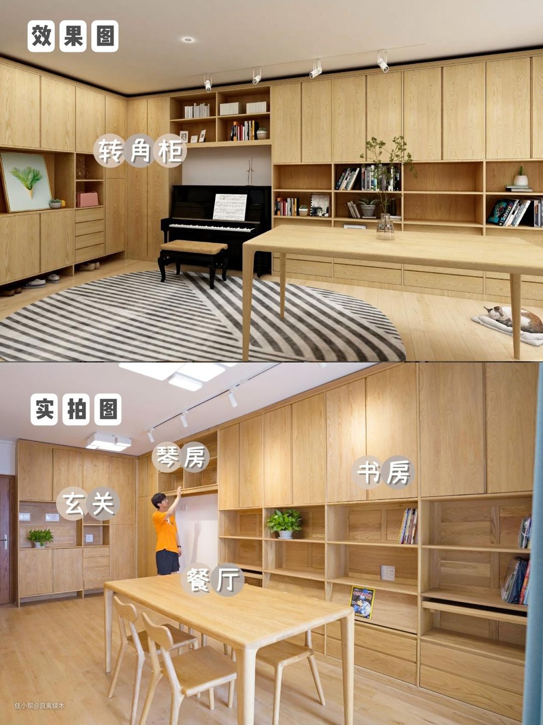 ②琴房:嵌入式的设计,下方镂空用来放琴,上方是开放式吊柜,放琴谱和摆件