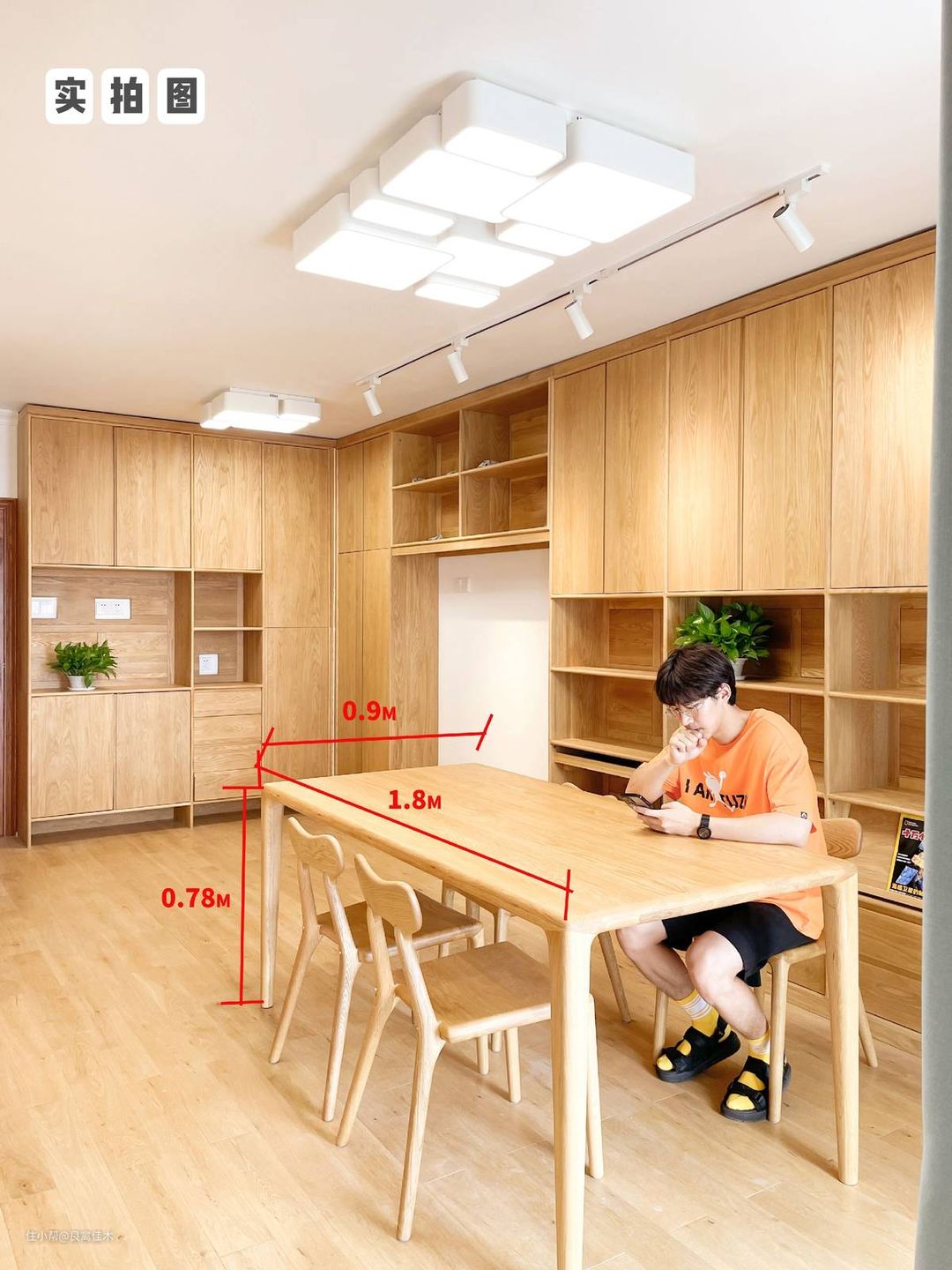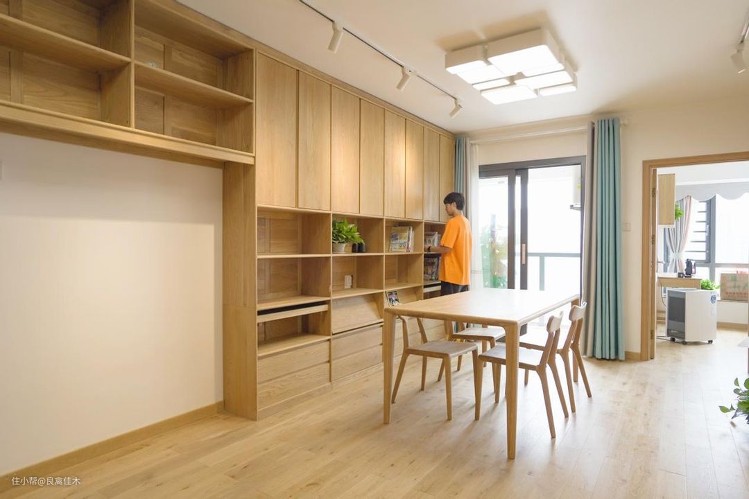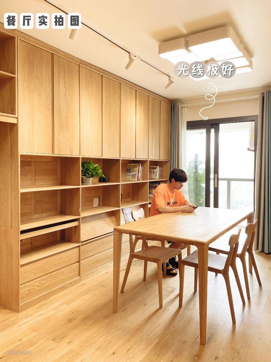 ④餐厅:在书柜前,由一张罗胖大方桌+四把椅子组成,正对阳台光线极好,除了用餐也是阅读学习爱的好地方。