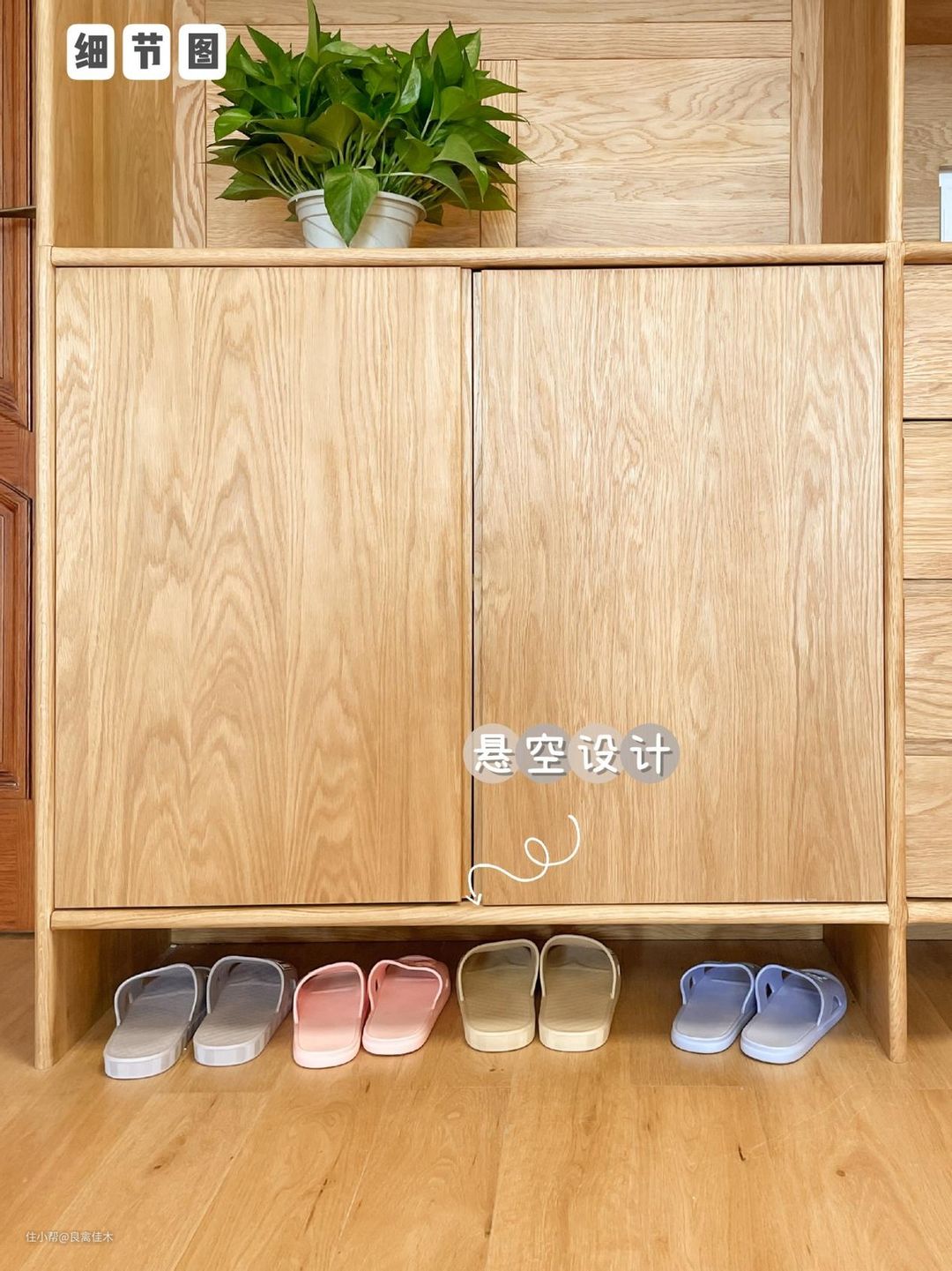 ①玄关区:鞋子,衣服,包包,杂物都有固定的区域,下方是悬空设计,方便换鞋的同时也方便打扫。