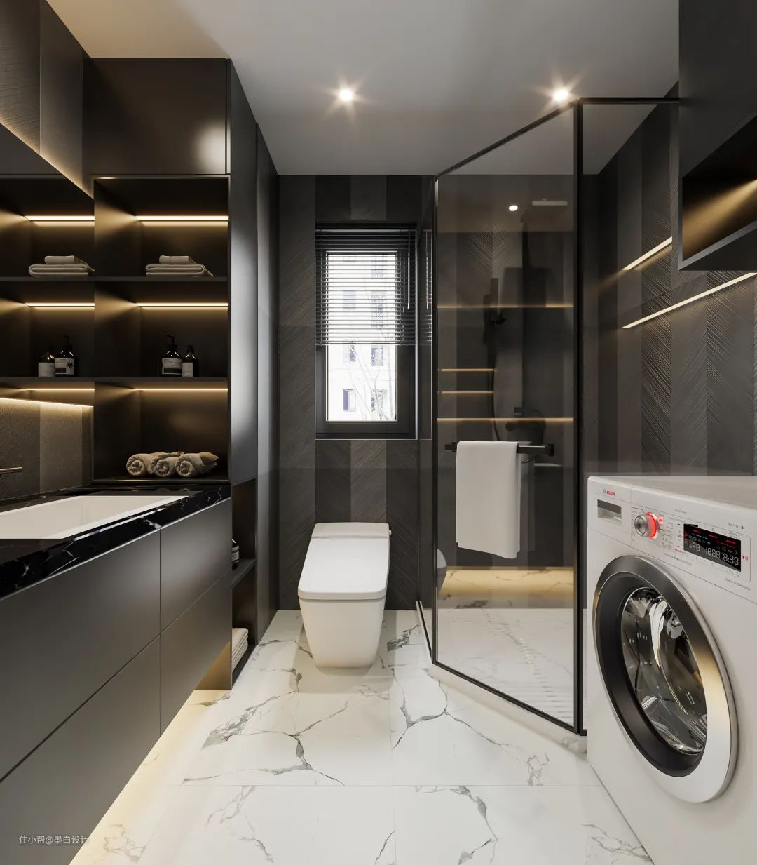 浴室也是利落有度的暗黑系,搭配白色的大理石瓷砖,黑白交互的那一刹那,即可感受到深邃感与前卫感并存融合的氛围。