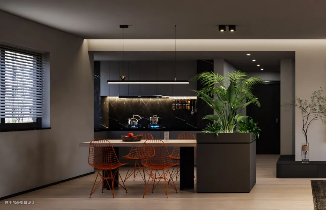 客厅、餐厅、厨房一体化,没有墙壁的阻挡开阔了空间。精致的极简吊灯强有力地烘托出用餐区域的美感和精致感,餐桌加以木质元素,使得整体有更自然轻松的氛围。将活力满盈的绿植元素巧妙地融合进用餐环境,不仅可以让室内更有生命力,同时可以削减暗黑给人带来的沉闷感。