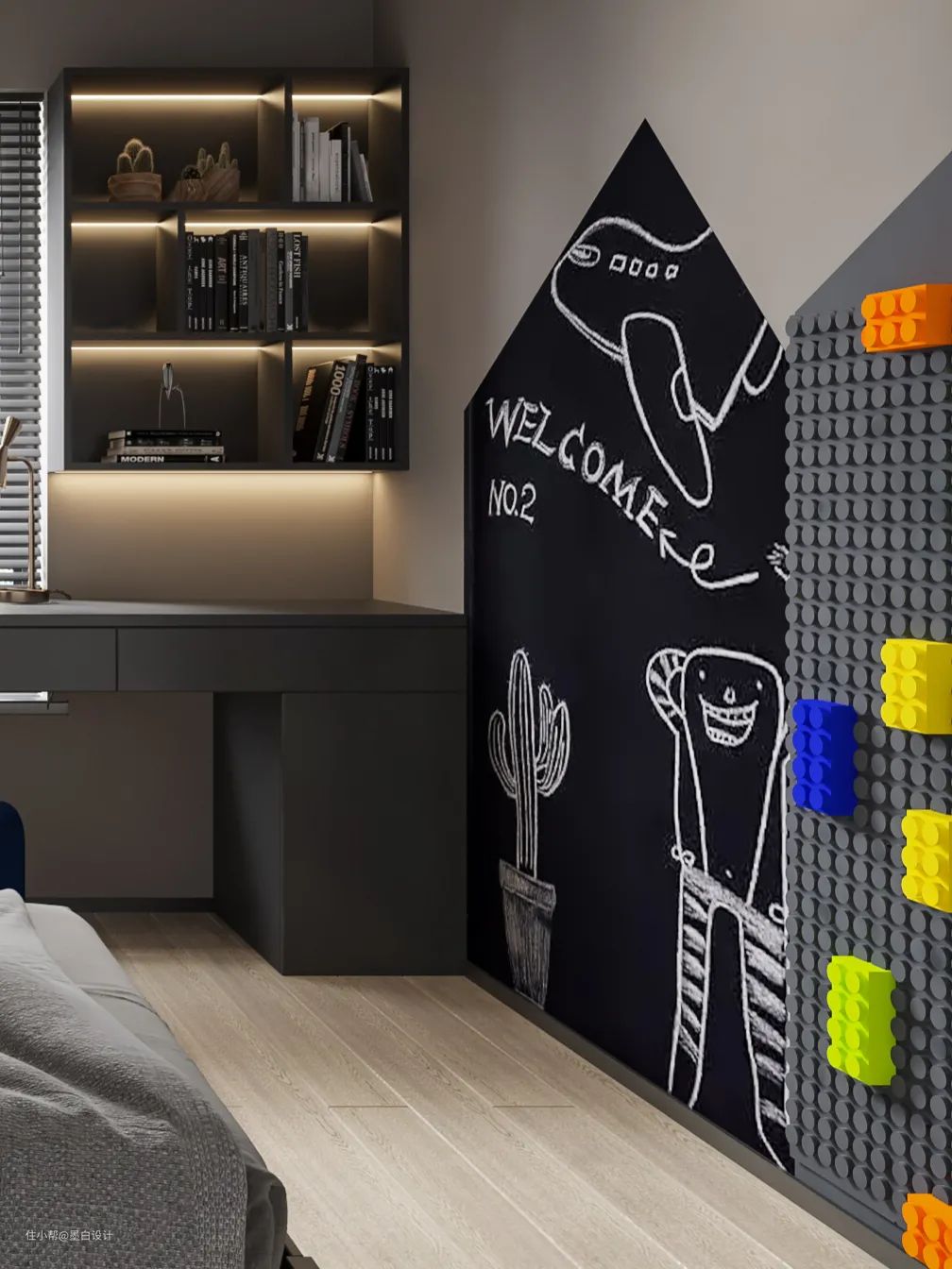 儿童房的打造更为活泼、亮丽,适用于孩童天性的释放,增加童趣元素吸引孩子的目光和眼球。