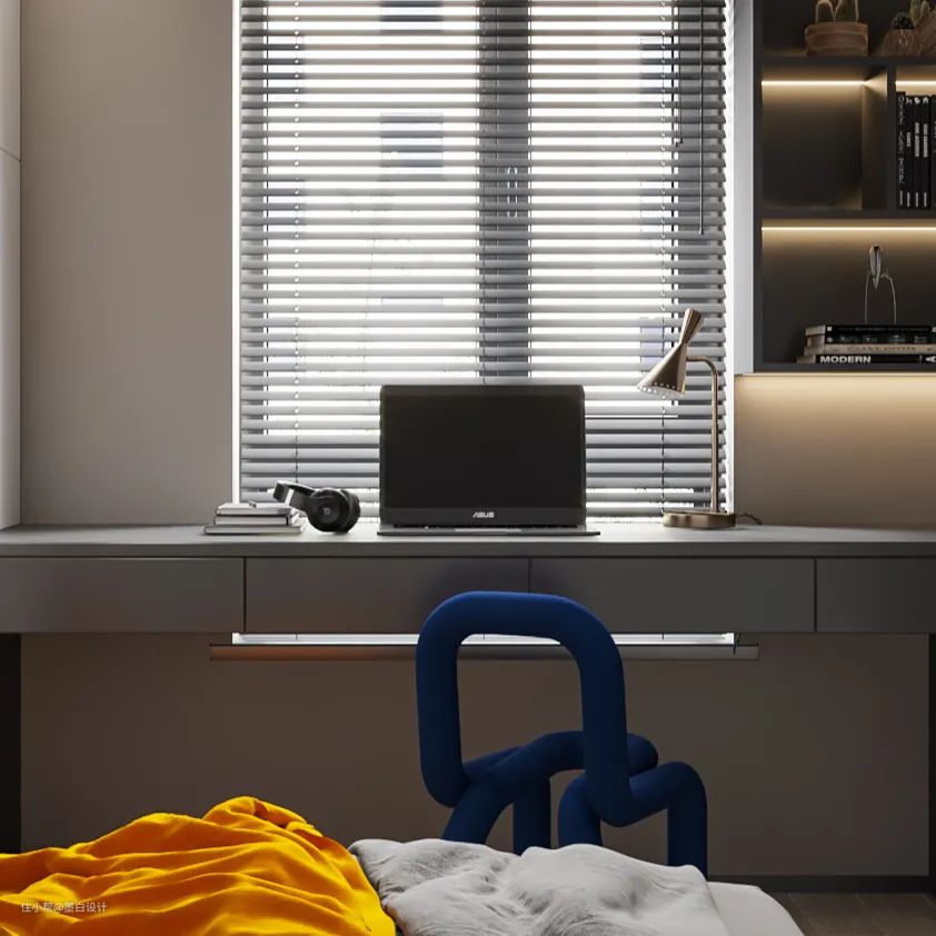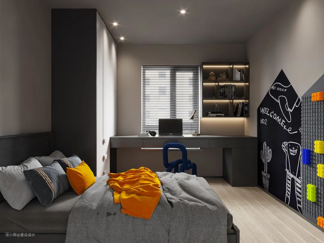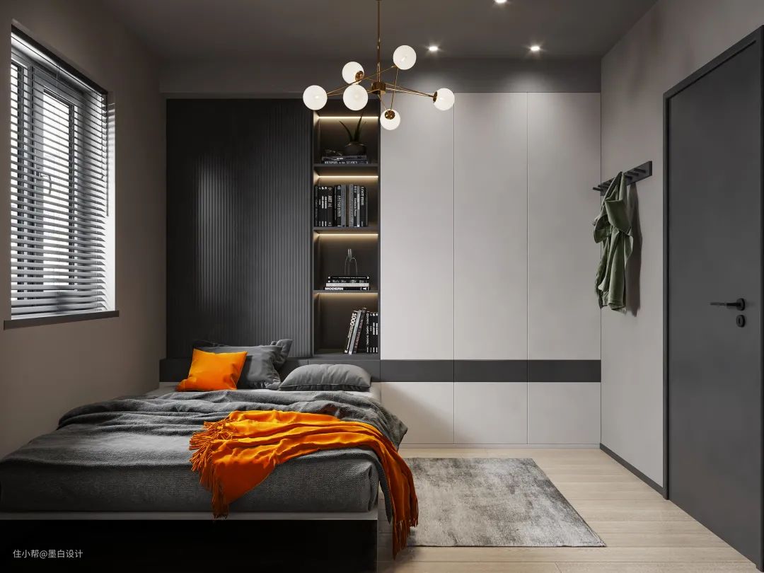 次卧也采用了黑白灰作为主色调。黑色的凝练、白色的纯净、灰色的调和,三者交互下带来一种炙热和低奢。除了颜色的美观,在实用度上也没有打折扣,超大容量的衣柜与书架满足业主的使用需求。