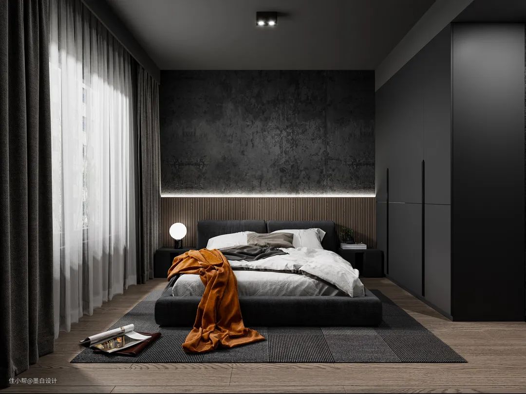 卧室的整体色调也是偏暗的,有助于睡眠但是却不觉得压迫,高级简约,有电影质感。卧室的背景墙做了纹理处理,低调而不无聊,递增了整个空间的层次感,同时也给空间增加了一丝神秘感,低调又高级。