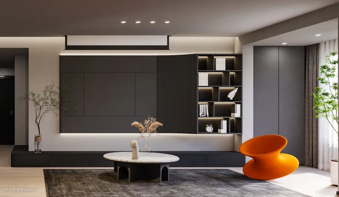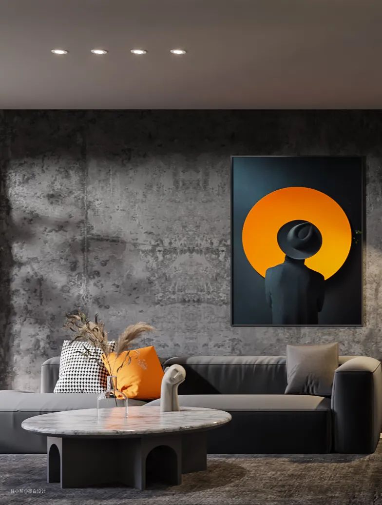 踏入客厅,极强的艺术氛围包裹了整个空间,极简的平面天花板,简约的顶灯,大理石茶几,电视背景墙的石材更加递增了空间颜色的层次感,暗黑的墙面纹路让空间没有那么单一枯燥,反而增加了相当的艺术感。