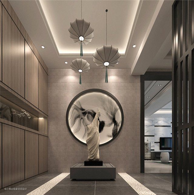 新中式玄关的绝妙之处在于将现代元素与传统元素结合在一起,以现代人的审美需求打造富有传统韵味的事物。
