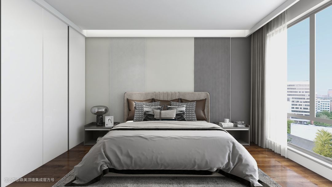 次卧吊顶采用极简设计,大平顶一气呵成,床头顶镂空内置光源,营造见光不见灯的氛围。背景墙灰白拼色,辅以格栅和装饰灯,在顶光的烘托下,质感立现。