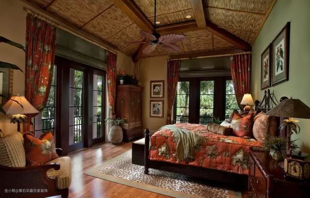东南亚风格广泛地运用木材和其他的天然原材料,如藤条、竹子、石材、青铜和黄铜,深木色的家具,局部采用一些金色的壁纸、丝绸质感的布料,灯光的变化体现了稳重及豪华感。