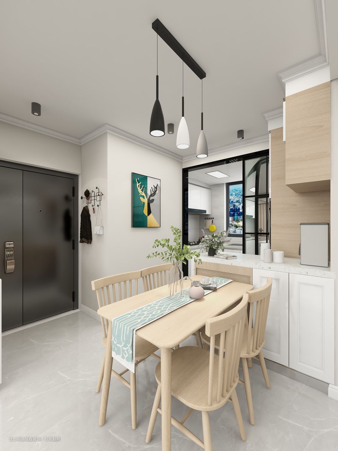 【餐厅】因为家里的整体基调都是白色的大白墙,干干净净简简单单。餐厅和客厅是相互共通的,不需要过多装饰,干净温暖即可。餐桌椅选择白橡木实木,颜色更加的奶油效果。