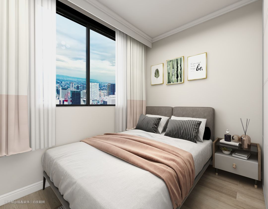 【次卧】次卧更偏向于素雅低调,棕咖色的床头软包,舒适度与颜值同等在线。床头柜的开放格处可以收纳书籍,抽屉内可以放更多物品。